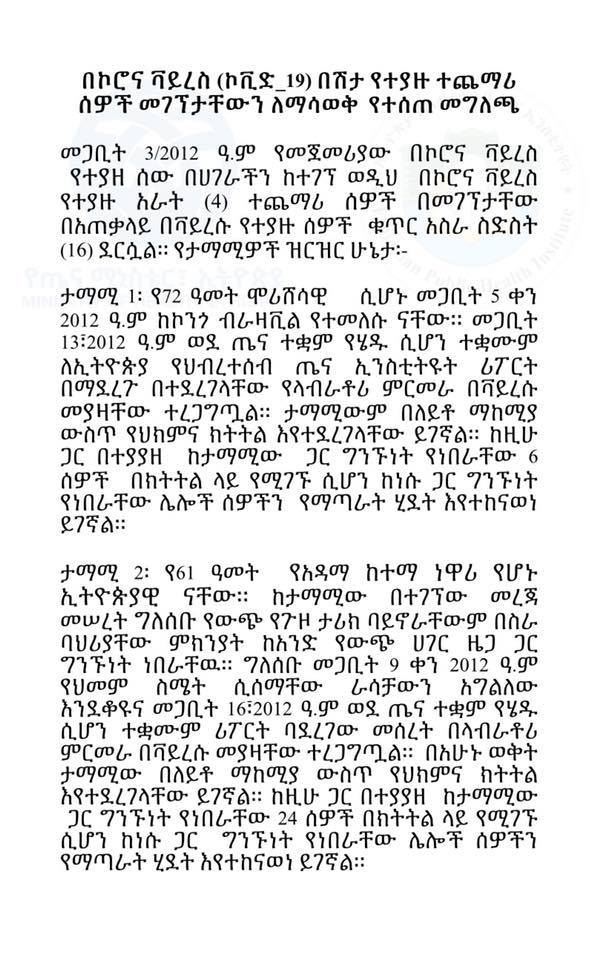 በኢትዮጵያ አራት ተጨማሪ ሰዎች በቫይረሱ መያዛቸውን መንግሥት አስታውቋል። ይህም በአጠቃላይ እስካሁን በኢትዮጵያ በቫይረሱ የተያዙ ሰዎችን ቁጥር 16 ያደርገዋል።