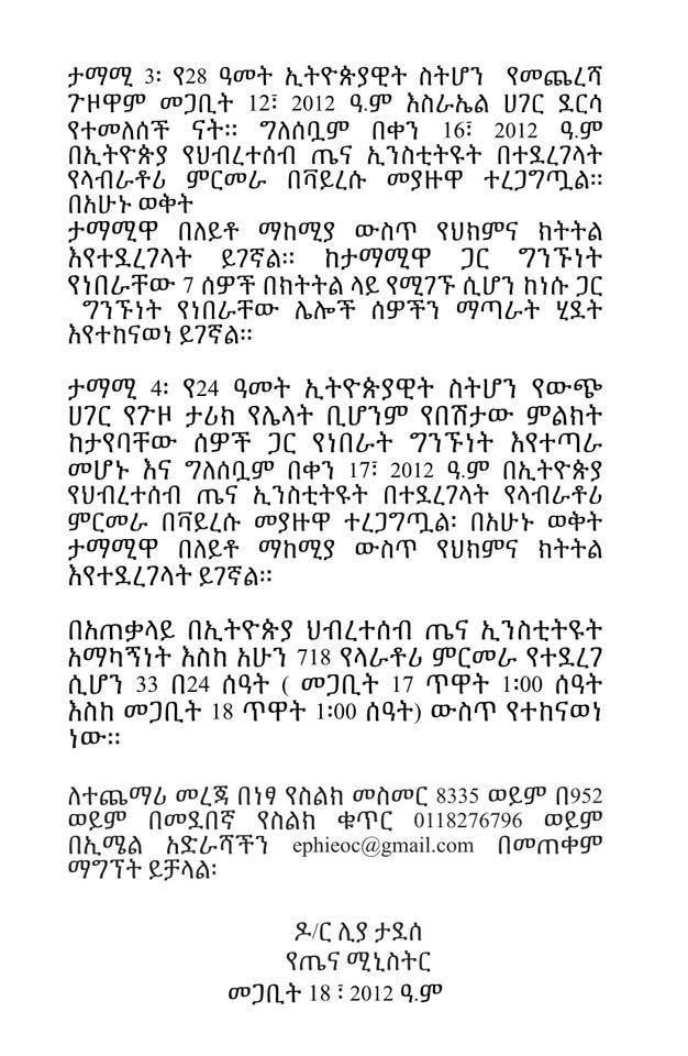– የ24 ዓመት ሴት፣ ኢትዮጵያዊት፣ የውጭ ሀገር የጉዞ ታሪክ የሌላት፤ ነገር ግን የበሽታው ምልክት ከታየባቸው ሰዎች ጋር የነበራት ግንኙነት እየተጣራ የሚገኝ። ምርመራ የተደረገላት መጋቢት 17 ቀን 2012።